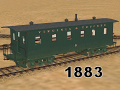 V & T Coach No 3Industry interactive (carries Western Passengers). Built in 1872. Air brakes were added in 1874. In 1878, this car was designated as a smoking car. This car is awaiting restoration at the Nevada State Railroad Museum. Version: 1872: TRS 2019 and later; 1880s: TRS 2004 and later |