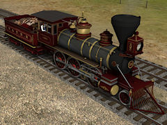 Locomotive No 11 (Reno)'Reno' was built in 1872 by Baldwin locomotive works. She is the oldest V&T locomotive still existing today. Reno was the favorite locomotive of the V&T, and was nicknamed 'Brass Betsy'. She was kept polished her entire life, and was the primary locomotive to pull the express train between Reno and Virginia City. Originally a wood burner, she was converted to coal in 1876, and to burn oil in 1907. She was the first V&T locomotive converted to burn oil. In 1945, she was sold to the movie studios, where she performed in over 20 movies, TV shows, and commercials. She is currently residing at Old Tuscon, where she has been cosmetically restored following a devastating fire in 1995. Drivers: 56 3/4 in Model by Ben Neal (bdaneal); links take you to his site, Subpar Productions. Also requires V&T Common files and Cabin for Reno, Genoa Version: TRS 2004 - TC2 |